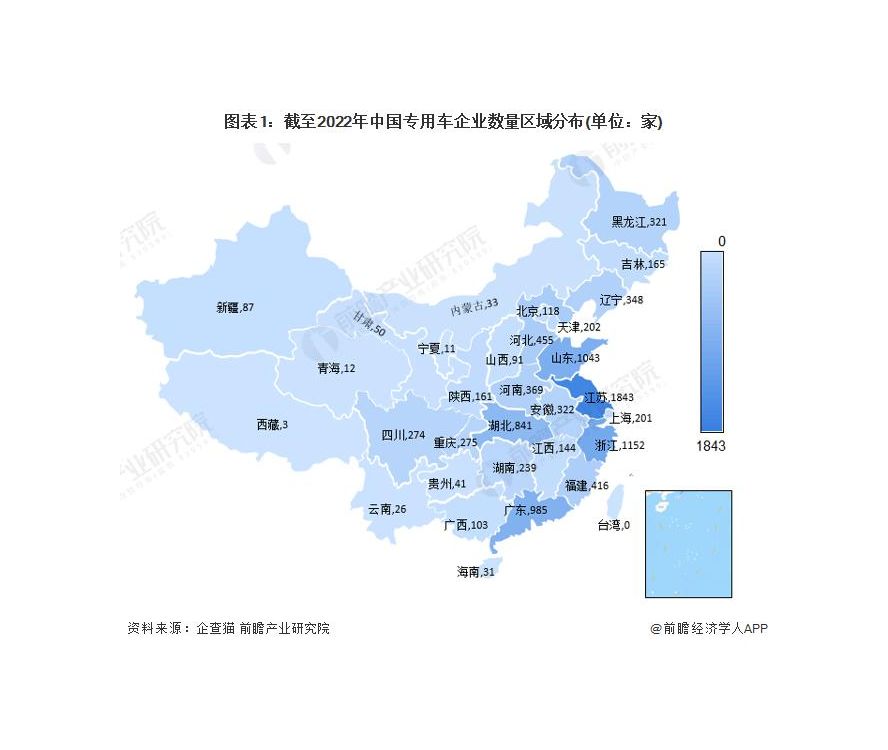 根據(jù)中國(guó)企業(yè)數(shù)據(jù)庫(kù)企查貓,目前中國(guó)專(zhuān)用車(chē)企業(yè)主要分布在江蘇、山東、浙江、廣東、湖北等地,其中江蘇企業(yè)數(shù)量最多。截至 2022 年 7 月中旬,江蘇共有相關(guān)專(zhuān)用車(chē)企業(yè)數(shù) 1843 家。
