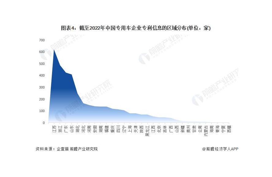 根據(jù)中國(guó)企業(yè)數(shù)據(jù)庫(kù)企查貓,目前中國(guó)專(zhuān)用車(chē)有相關(guān)專(zhuān)利信息的企業(yè)主要分布在江蘇和浙江等地。截至目前,江蘇省共有 621 家企業(yè)擁有專(zhuān)利相關(guān)信息,而浙江則有 487 家企業(yè)擁有專(zhuān)利相關(guān)信息。